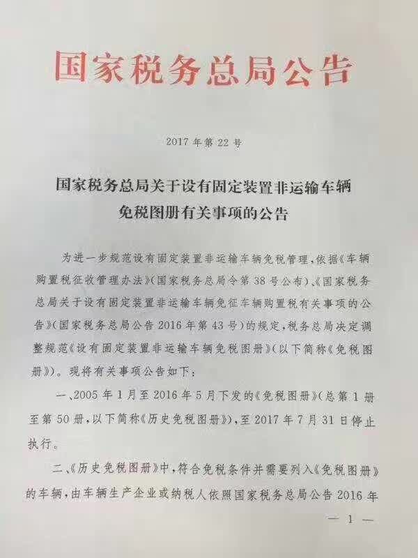 關于之前一直眾說紛紜的,環(huán)衛(wèi)車將2017年7月1日專用車取消免稅說法,現在國家稅務總局的正式文件已經下發(fā), 已證實, 并不是取消專用車免稅政策, 只是從7月1日起更換免稅圖冊, 新的免稅圖冊沒有下來之前不能辦理免稅 ,所以請需要購新車的客戶提前訂車, 避免造車麻煩 ,環(huán)衛(wèi)車購置稅免征情況說明1、《歷史免稅圖冊》(2005年1月-2016年5月下發(fā)的《免稅圖冊》)將于2017年7月31日停止執(zhí)行。2、《歷史免稅圖冊》中的免征車型由車輛生產企業(yè)于2017年6月30日前重新提交相關信息與資料進行審核,更新《免稅圖冊》。原文如下: